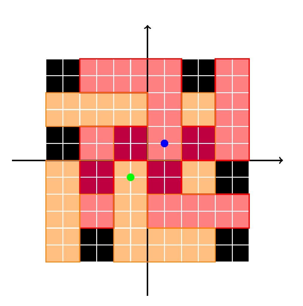 float x0 = (width / 2) - 1 + 0.5, y0 = (height / 2) - 1 + 0.5; for (int i = 0; i < n; ++i) { float centerx = x0 + x[i], centery = y0 - y[i]; for (int j = 1; j <= p[i]; ++j) { for (int k = 1; k <= p[i]; ++k) { checkAndChange((int) (centerx + j - 0.5), (int) (centery - k + 0.5)); checkAndChange((int) (centerx + j - 0.5), (int) (centery + k)); checkAndChange((int) (centerx - j + 0.5), (int) (centery - k + 0.5)); checkAndChange((int) (centerx - j + 0.5), (int) (centery + k)); } }